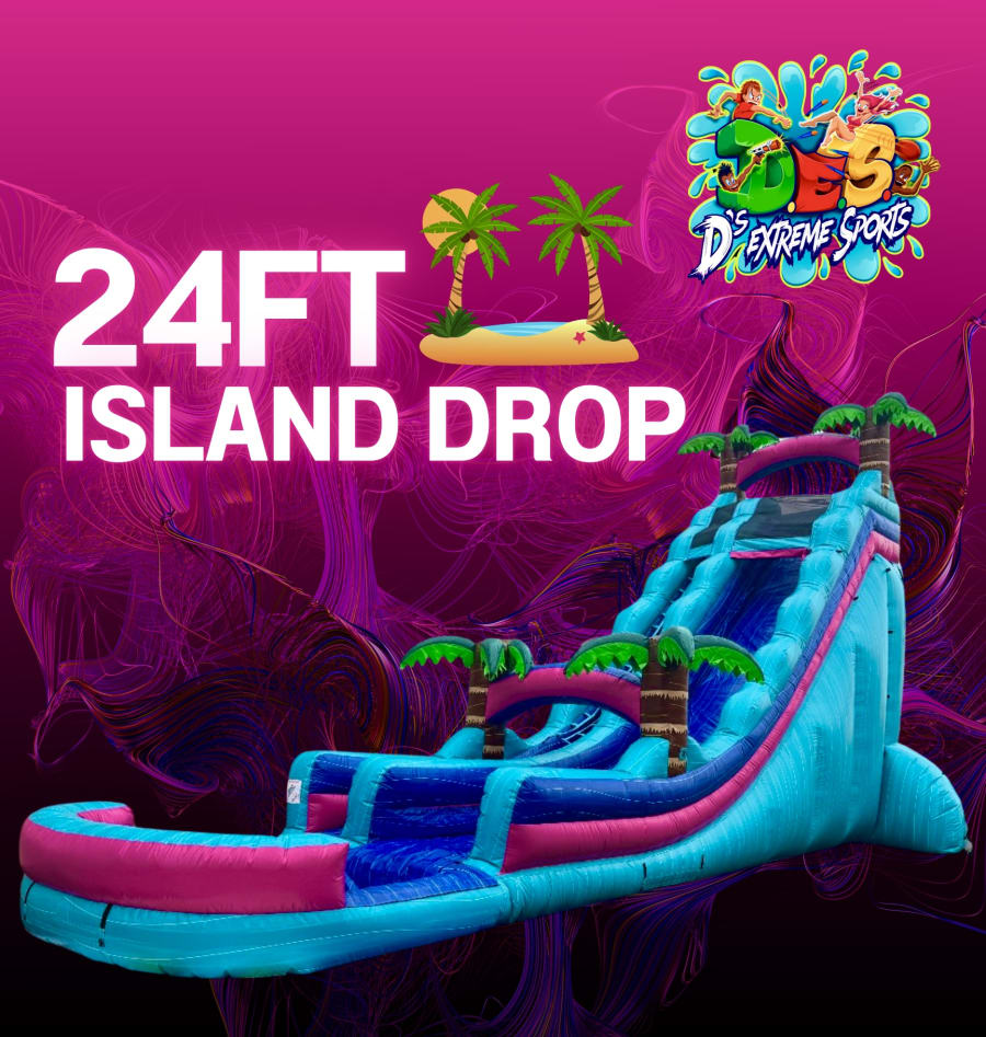 The 24Ft Island Drop is our absolutely favorite attraction because it is the life of the party. This eye-catching, 24-foot centerpiece brings instant excitement to backyard birthdays, block parties, festivals, corporate events, and school carnivals. Designed for high-impact fun, the 24Ft Island Drop creates memorable moments and nonstop photo ops.